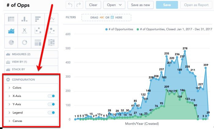 For each of the measure/attribute in your insight, you can change the color in which the insight displays it. For example, you want to display Opportunities won in green and Opportunities lost in blue.